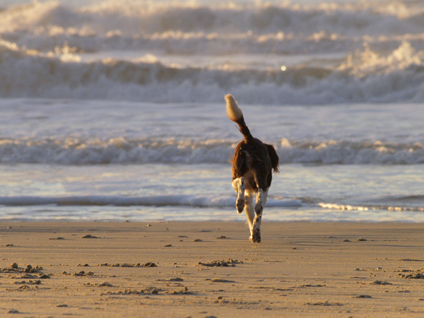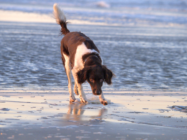 Frauchen sagte, wenn man Cleo hier aus dem Auto lässt, ist es so, als würde man einen Flummi werfen... mit Winseln und Heulen (ich freu mich dann und muss das auch ausdrücken :-) schiesst und hüpft sie los. Ich musste überall schnüffeln und äugeln, aber leider sehe ich ja nicht mehr soviel, umso intensiver nehme ich die Geschichten der Gerüche und Geräusche auf... einen ganzen Möwenflügel habe ich gefunden und natürlich aufgefressen, Vera versuchte zwar, mir den aus dem Maul zu holen, aber da war ich unerbittlich : Diesen Schatz habe ich NICHT losgelassen!!!! (Zwei Tage später kam ein etwas kleinerer Flügel aus meinem anderen Ende wieder hervor :-)) Ein grosses Fischgerippe habe ich gefunden, das wollte ich auch fressen, aber da hat es Vera geschafft, es mir weg zu nehmen, indem sie mir ein Wurststückchen vor die Nase gehalten hat. Gemein, oder? Denn im Nachhinein hätte ich lieber das Gerippe behalten, aber das Würstchen hat so verführerisch gerochen!